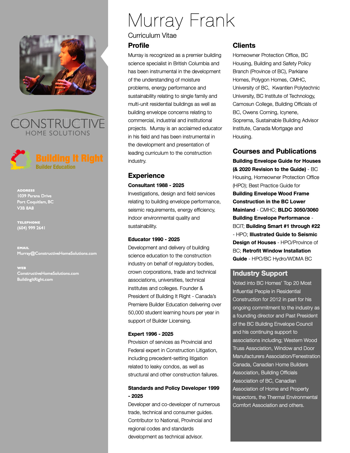Murray is recognized as a premier building science specialist in British Columbia and has been instrumental in the development of the understanding of moisture problems, energy performance and sustainability relating to single family and multi-unit residential buildings as well as building envelope concerns relating to commercial, industrial and institutional projects. Murray is an acclaimed educator in his field and has been instrumental in the development and presentation of leading curriculum to the construction industry.